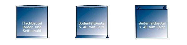 | Flachbeutel Seitennaht | 0,03 – 0,13 mm | 80 – 600 mm | 150 – 900 mm |